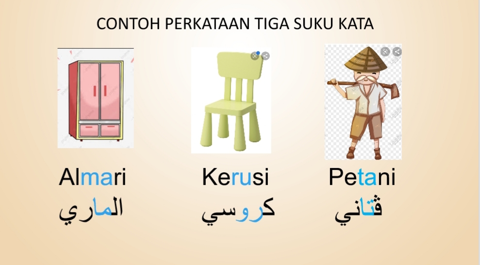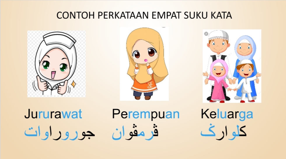 Alhamdulillah,semua sudah mengetahui apa itu contoh-contoh perkataan tiga suku kata atau lebih,Seterusnya, ustazah akan menunjukkan contoh tiga suku kata dan empat suku kata.